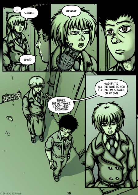 My favourite panels are the first and second, an odd thing given how bad they looked in the sketch but somehow they worked out as more than the sum of their parts. Scratch’s ‘don’t give a damn’ expression feels spot on and I was especially pleased with the way the light catches the edge of Curt’s face in the first image. The third and last panels meanwhile feel functional at least but at the same time didn’t quite capture what I wanted; Curt’s expression seems too understated while conversely Scratch’s brooding irritation is a little too overt maybe.