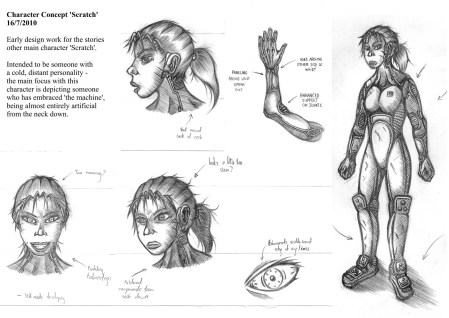 Early design for my other central character – a cyborg nicknamed ‘Scratch’. While there were a few things I liked about this concept (which you may see in the reworked version), I dismissed it due to general impracticalities and an undesirable clumsy appearance. Ultimately just a little too silly.