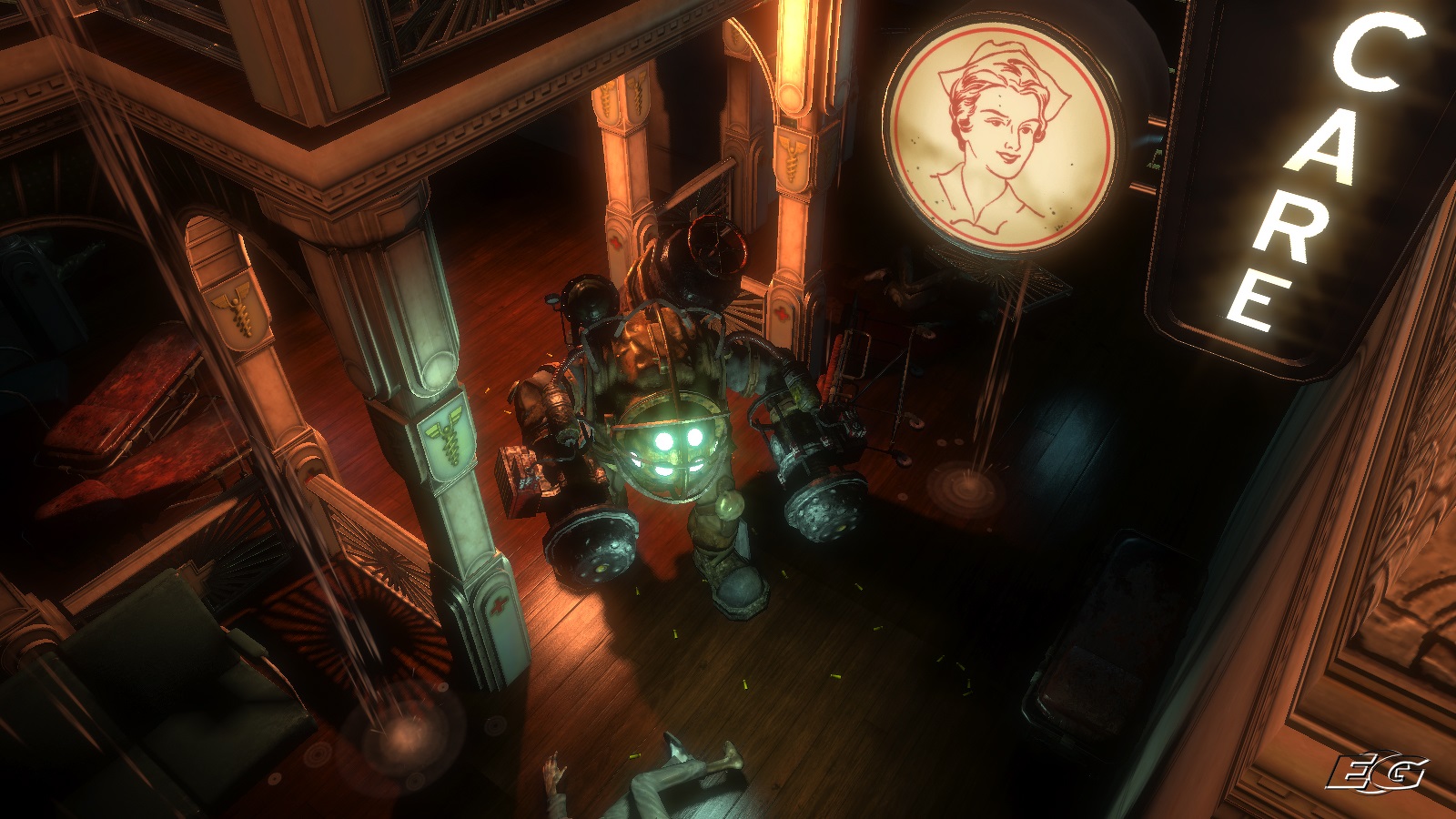Picking up audio logs depicting the decline of civilised values over to animalistic bio-horror? You got it. A silent protagonist with no back-story dropped in to fix things? Of course. Near constant solitude and danger? Naturally. There’s even a big twist in the final act where your guide over the radio turns out to be the main villain, sound familiar? To anyone who’s played System Shock 2 it’s basically business as usual with an art deco twist.
