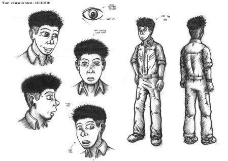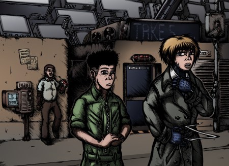 Possibly the most troublesome aspect of the piece though was the colours, specifically creating a palette suitable to the mood but also striking enough to make the background and foreground distinct. As with previous colour work I used Corel Photo Paint 11as while I am competent with Adobe Photoshop I can work quicker with the former thanks to its preferable toolset and streamlined interface.In terms of the distant and immediate buildings, I gave the foreground a brown-orange hue and set it against a background of blue-grey tones to play upon complimentary colours and make the nearby scenery standout. I kept both of these elements fairly muted to evoke an appropriately grim atmosphere but also to avoid drowning out my characters. In contrast I made Scratch and Curt as brightly coloured as I dared to draw the viewer’s attention to them first.