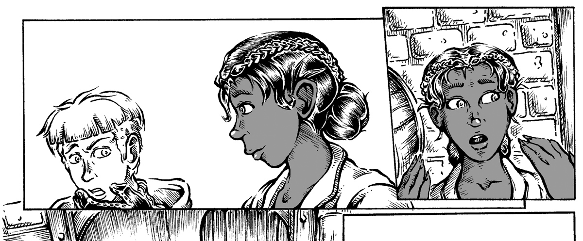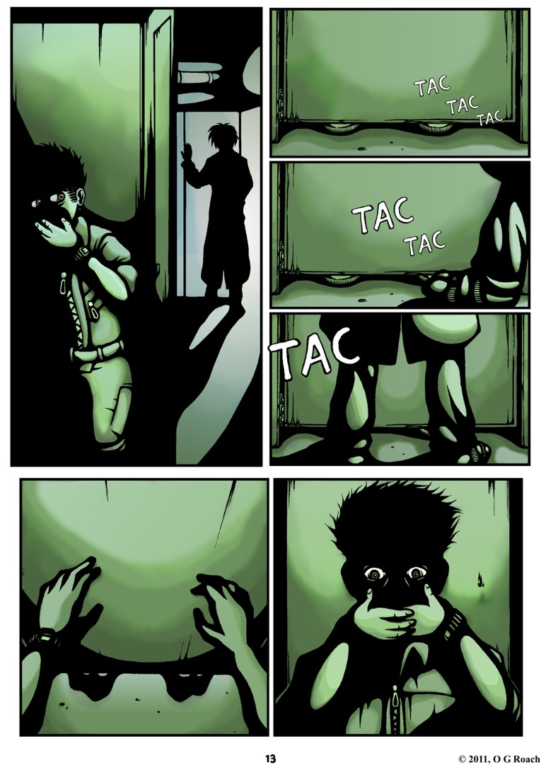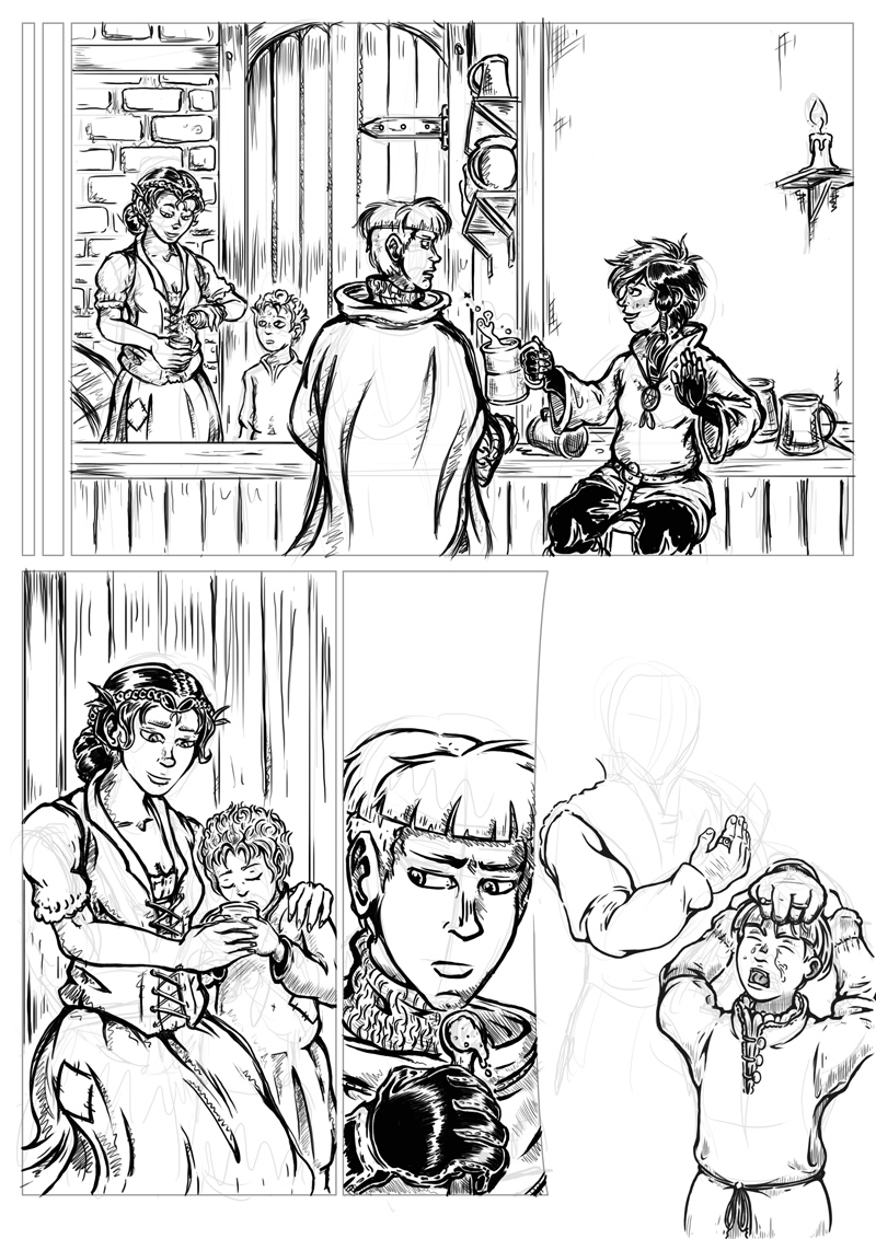 Also weighing in on this matter is my increasing lean towards digital inking over the last few pages; it started out as an experiment with a single panel on page 13 before being applied to whole pages in the last few. In spite of my initial impressions the process works remarkably well with light and shadow imagery, making it more a process of cutting out highlights than awkwardly planning out shadow on paper (I only have so much ink to waste after all).