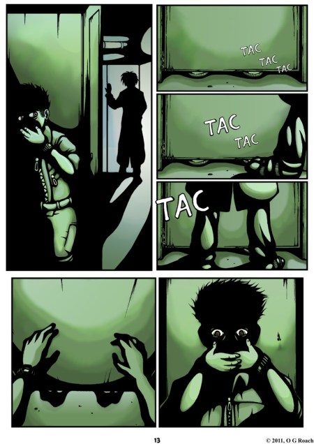 Considering the technique itself; while I normally pencil and ink all my linework by hand I do clean it up digitally after scanning and occasionally correct mistakes, with the first panel here I tried something a little different as an experiment. Having penciled the panel in rough I scanned it in and worked over it in Photo-Paint, beginning with a purely black overlay set to 50% transparency and cutting out the highlighted areas. This wouldn’t have worked were it a well-lit scene featuring cross hatching rather than heavy shadow, but in this case the results weren’t half bad inadvertently having a slightly Geoff Grandfield quality. I’m not changing over to an entirely digital production process anytime soon, but I may well dabble in future.