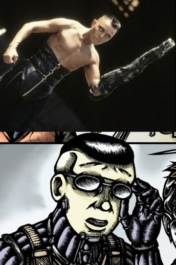 The background itself meanwhile appears to be consciously muted in greys, greens and dark blues to keep the emphasis on Spider and thanks to the raised angle seemingly stands beneath him –another character hint – and is packed with litter, grime and filth of several varieties. This is evidently a used future and not a pleasant one at that.